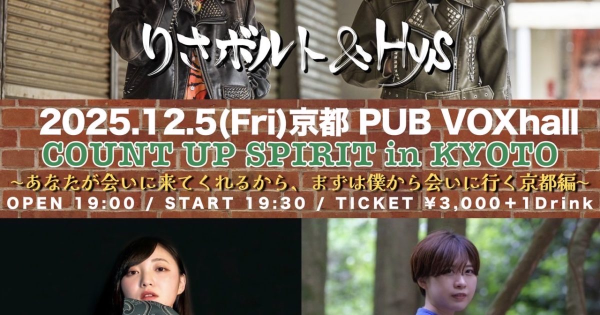 ライブイベント COUNT UP SPIRIT in KYOTO 〜あなたが会いにきてくれるから、 まずは僕から会いに行く京都編〜 Tweet 2025.12.05 出 演 ひなね林愛果りさボルト&Hys 詳 細 OPEN 19:00 / START 19:30 TICKET ¥3,000(+1Drink) チケットを予約する
