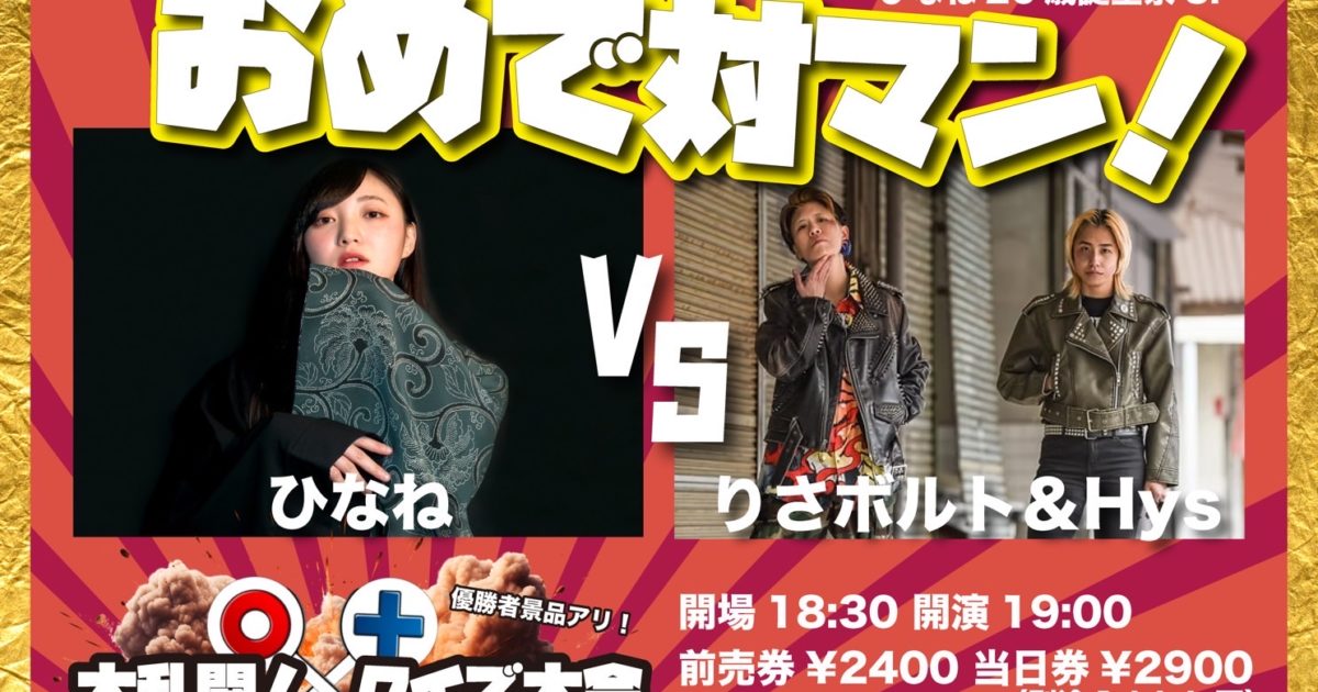 ライブイベント -ひなね26歳誕生祭SP- 〜ひなね ×りさボルト&Hys 〜 Tweet 2026.03.09 出 演 ひなね りさボルト&Hys (司会:とくらたくろう/犬人間ニョンズ) 詳 細 開場18:30開演19:00 前売券¥2400当日券¥2900 (別途1drink要) 入場特典:o×クイズ大会(優勝者景品アリ)への参加カード チケットを予約する