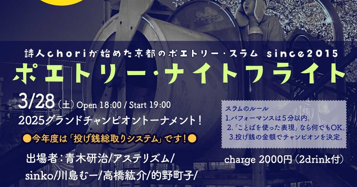 ライブイベント ポエトリー・ナイトフライト Tweet 2026.03.28 出 演 詳 細 open 18:00 / start 19:00 charge 2000円(2drink込) チケットを予約する