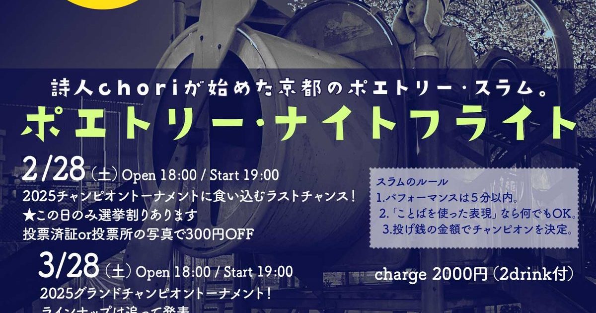 ライブイベント ポエトリー・ナイトフライト Tweet 2026.03.28 出 演 詳 細 open 18:00 / start 19:00 charge 2000円(2drink込) チケットを予約する